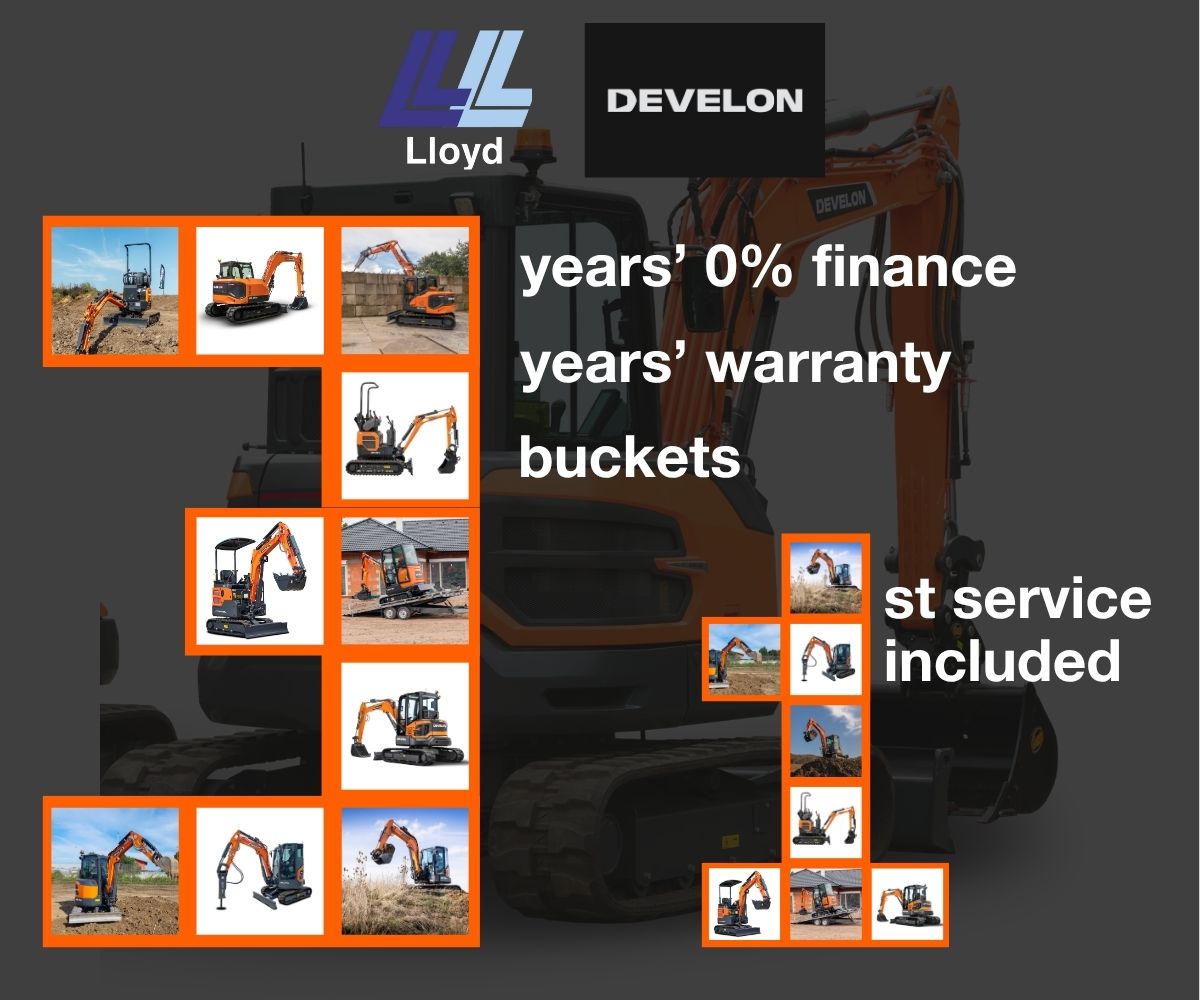 * Terms and conditions: Finance for business purposes only. Subject to acceptance and affordability checks. Applicants must be 18 or over. Offer on new equipment only. Minimum deposit 15% (plus VAT) are due on signing. 0% finance on Develon mini-excavators is available for up to 36 months on machines in Lloyd Ltd stock only.  Durations up to 7 years at different flat rates are also available. Valid 1st November – 31st December 2025. The finance product offered under this promotion is Hire Purchase. First payment, full VAT and a documentation fee of £200 (inc VAT) are all due on signing. An option to purchase fee of £100 (inc VAT) will be collected with the final payment. You will own the machine when all payments have been made. First service included as per the manufacturer’s warranty. Finance provided by BNP Paribas Leasing Solutions Limited, Northern Cross, Basingstoke, RG12 4HL. Registered in England, No. 901225. Alternative finance products are available, terms and conditions apply. Images for illustrative purposes only. As funder, BNP Paribas Leasing Solutions Limited will pay a commission, fee or other remuneration to credit brokers who introduce business to them; please contact them if you require more information. Lloyd Ltd is authorised and regulated by the Financial Conduct Authority for consumer credit activities under FRN 669526 – we are a credit broker not a lender.